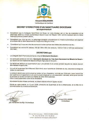 - Considérant que la Collégiale Saint-Pierre de Douai, en notre diocèse, est un lieu de d'adoration et de pèlerinage dédié au miracle eucharistique depuis le jour de Paques 1254, comme expliqué dans la notice historique jointe au présent décret ;