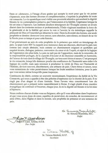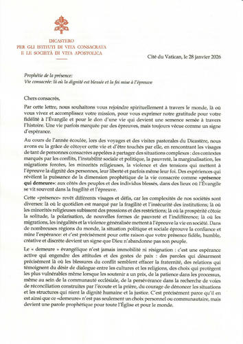 Le Dicastère pour la vie consacrée a publié le 28 janvier dernier (voir ci-dessous), une lettre adressée aux personnes consacrées, intitulée « Prophétie de la présence ». Celle-ci parle « des expériences qui révèlent la dimension prophétique de la vie consacrée, comme présence qui demeure : aux côtés des peuples et des individus blessés, dans les lieux où l’Evangile se vit dans la fragilité et l’épreuve ».