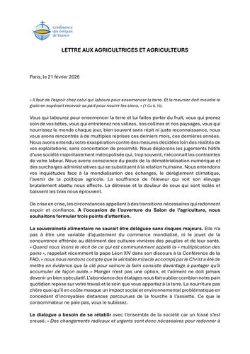 Vous qui labourez pour ensemencer la terre et lui faites porter du fruit, vous qui prenez soin de vos bêtes, vous qui entretenez nos vallées, nos collines et nos paysages, vous qui nourrissez le monde chaque jour, bien souvent sans répit ni juste reconnaissance, nous vous avons rencontrés à de multiples reprises ces derniers mois, ces dernières années. Nous avons entendu votre exaspération contre des mesures décidées loin des réalités de vos exploitations, sans concertation de proximité. Nous déplorons les jugements hâtifs d’une société majoritairement métropolisée qui, trop souvent, méconnait les contraintes de votre labeur. Nous avons conscience du poids de la dématérialisation numérique et des surcharges administratives qui se substituent à la relation humaine. Nous entendons vos inquiétudes face à la mondialisation des échanges, le dérèglement climatique, l’avenir de la politique agricole. La souffrance de l’éleveur qui voit son élevage brutalement abattu nous affecte. La détresse et la douleur de ceux qui sont isolés et baissent les bras nous éprouvent.