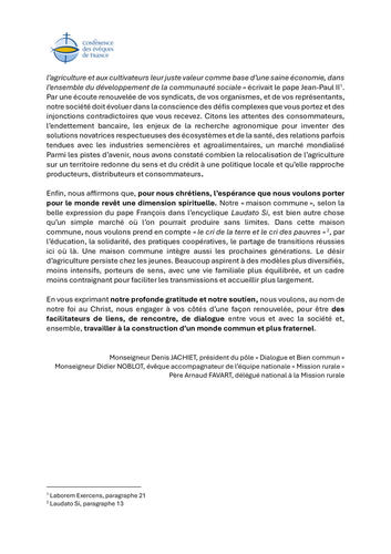 Enfin, nous affirmons que, pour nous chrétiens, l’espérance que nous voulons porter pour le monde revêt une dimension spirituelle. Notre « maison commune », selon la belle expression du pape François dans l’encyclique Laudato Si, est bien autre chose qu’un simple marché où l’on pourrait produire sans limites. Dans cette maison commune, nous voulons prend en compte « le cri de la terre et le cri des pauvres » 2, par l’éducation, la solidarité, des pratiques coopératives, le partage de transitions réussies ici où là. Une maison commune intègre aussi les prochaines générations. Le désir d’agriculture persiste chez les jeunes. Beaucoup aspirent à des modèles plus diversifiés, moins intensifs, porteurs de sens, avec une vie familiale plus équilibrée, et un cadre moins contraignant pour faciliter les transmissions et accueillir plus largement.